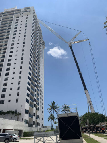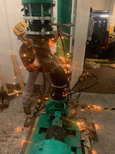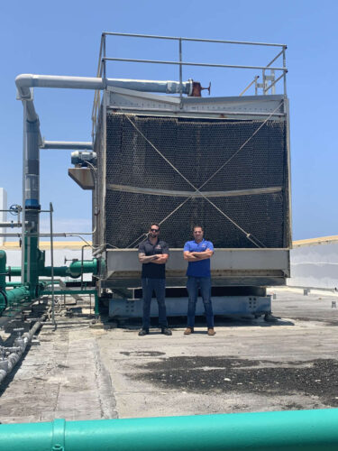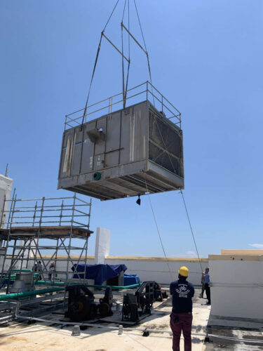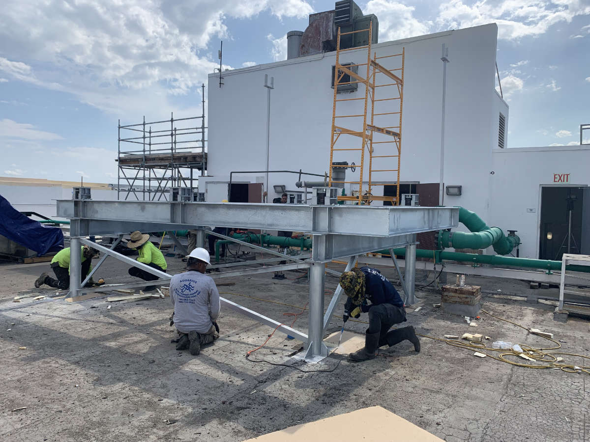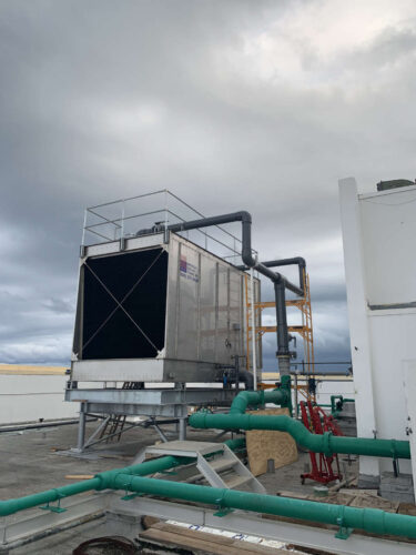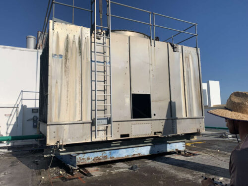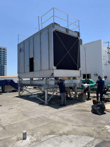 This building was having issues of high temperature on the condenser water system due to a lack of capacity, and the equipment support was corroded. We made a new support and installed a higher capacity cooling tower to fullfill the lack of capacity.